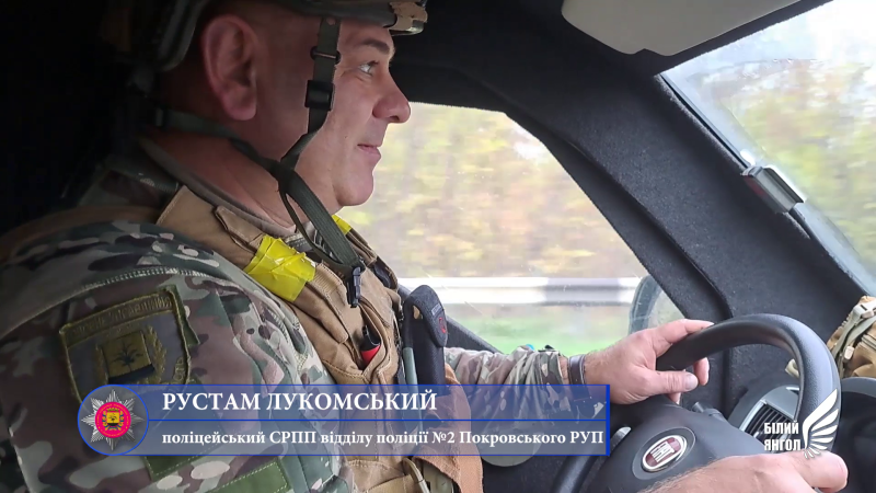 Поліцейський сектору реагування патрульної поліції ВП №2 (м. Курахове) Рустам Лукомський отримав поранення в серпні під час евакуації людей з Мар'їнки. Того дня артилерійський снаряд розірвався біля службового автомобіля, постраждали двоє правоохоронців. Незважаючи на кровотечу, співробітники поліції вивезли людей з-під вогню до безпечного місця.