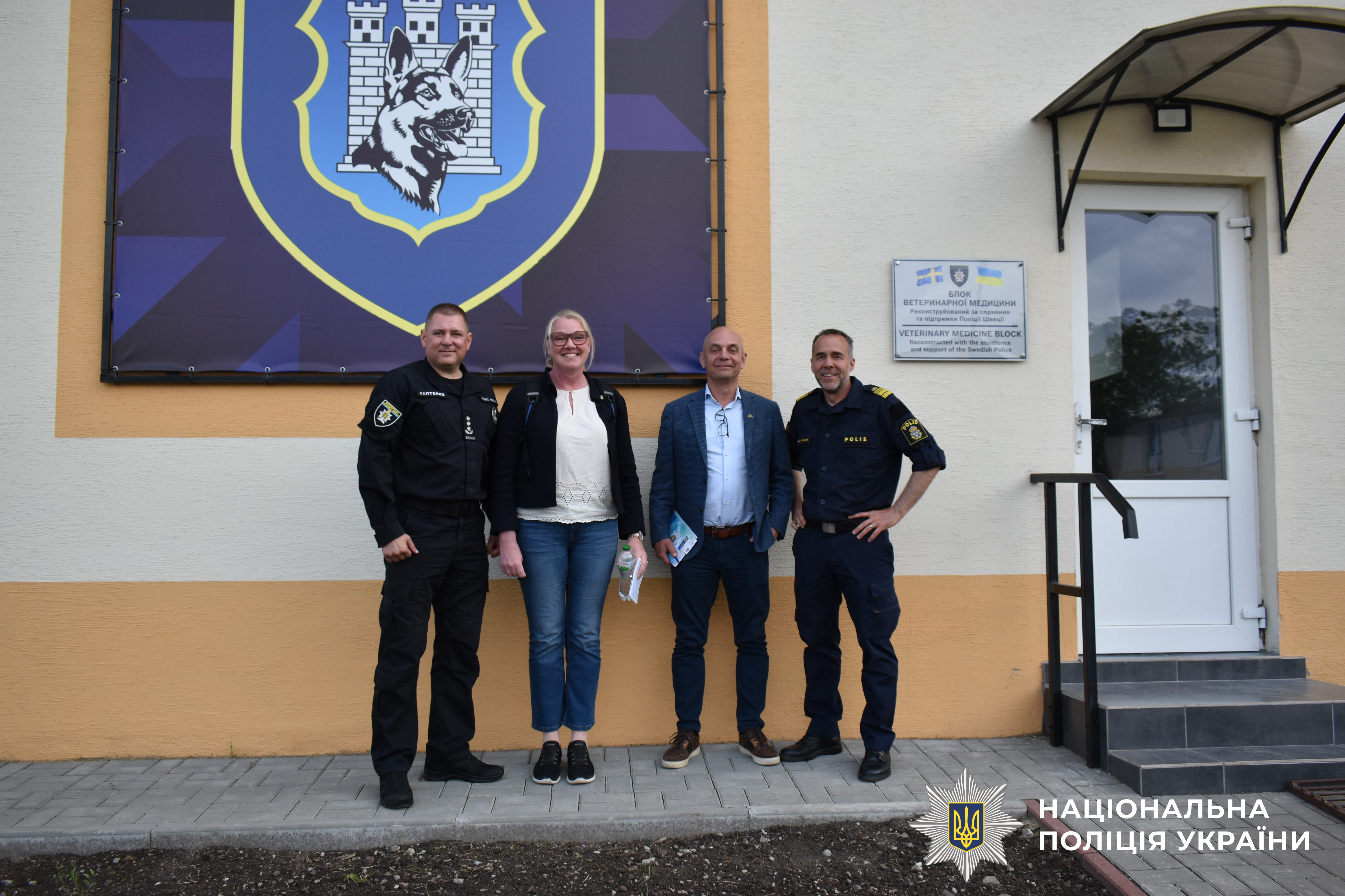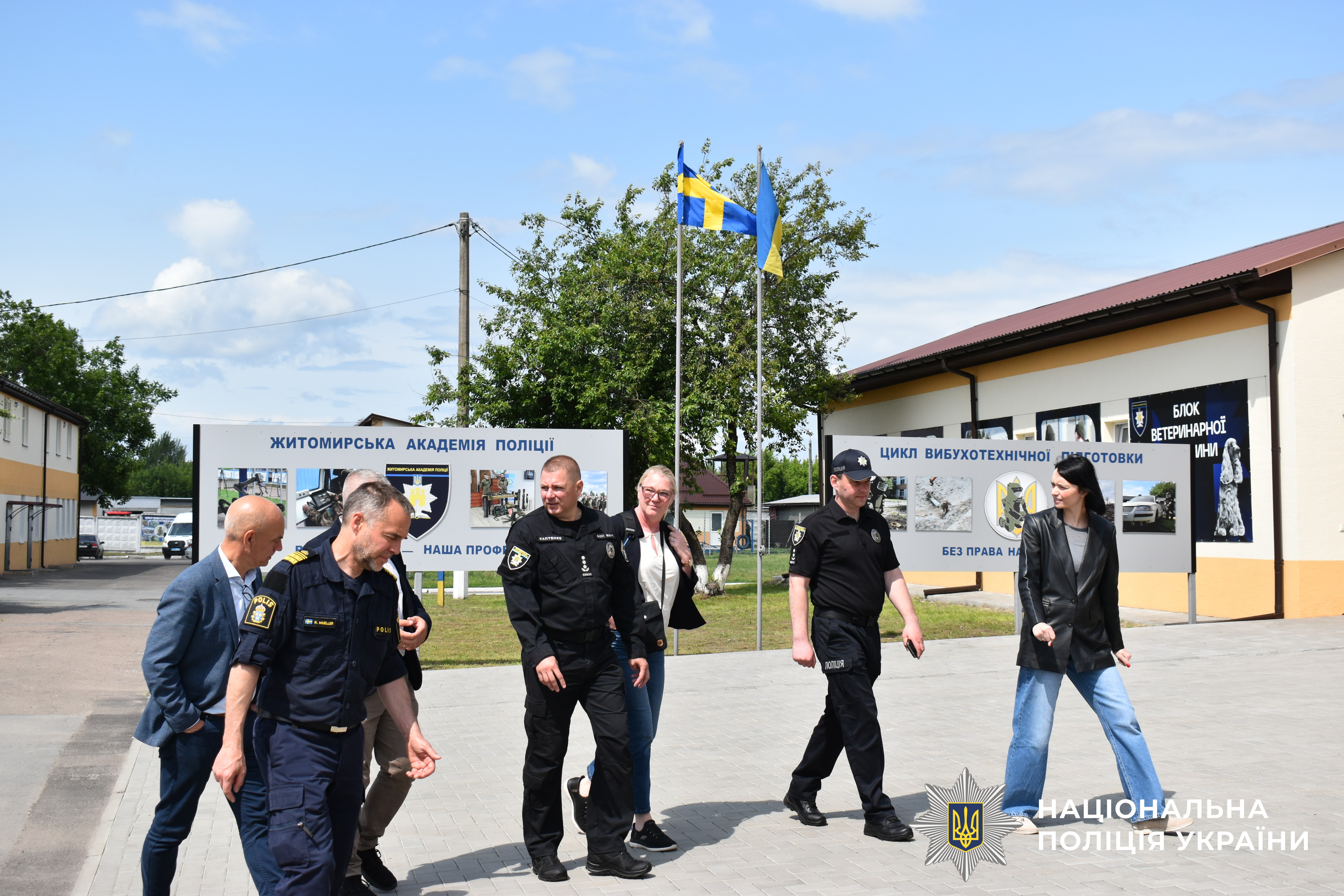 Після цього, іноземні делегати відвідали Житомирську академію поліції, яка є єдиним в Україні закладом освіти зі специфічними умовами навчання, де навчають та підвищують кваліфікацію поліцейські вибухотехніки і кінологи. Поліцейські показали шведським партнерам, як за їх сприяння реалізується оновлення циклу кінології на базі академії. На завершальному етапі перебуває будівництво та оснащення адмінбудівлі, вольєрних комплексів, блоку ветеринарної медицини.