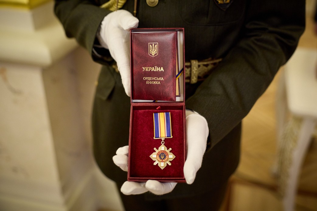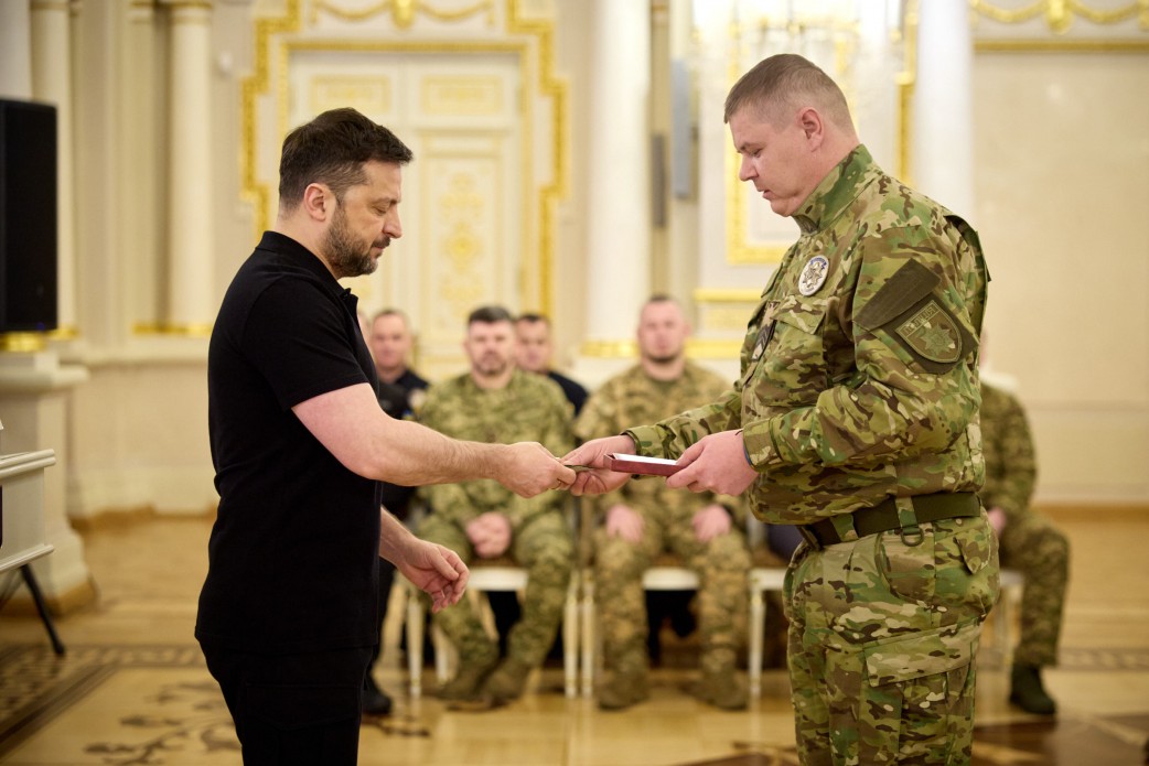 Президент України Володимир Зеленський нагородив бійця Об’єднаної штурмової бригади Нацполіції «Лють» Володимира Мазура орденом «За мужність» ІІІ ступеня
