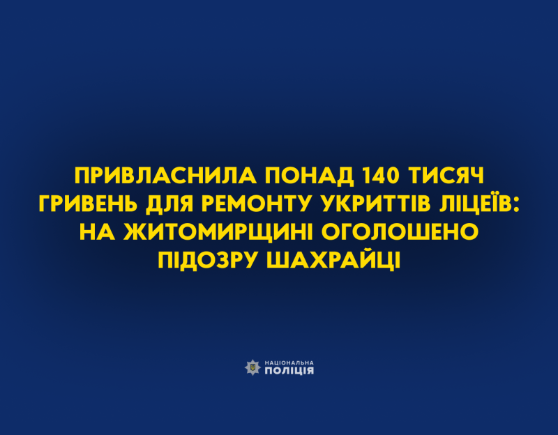 Привласнила понад 140 тисяч гривень для ремонту укриттів ліцеїв: на Житомирщині оголошено підозру шахрайці