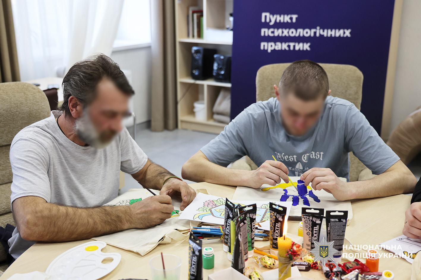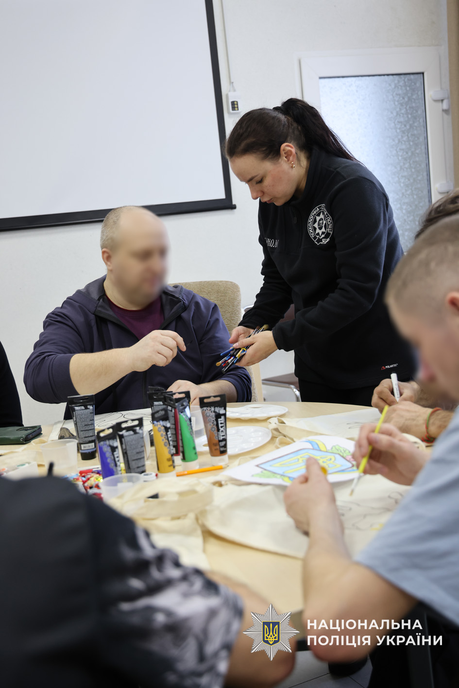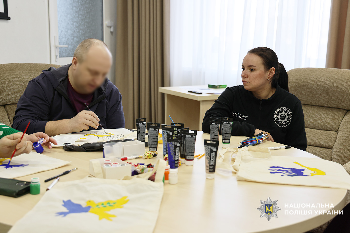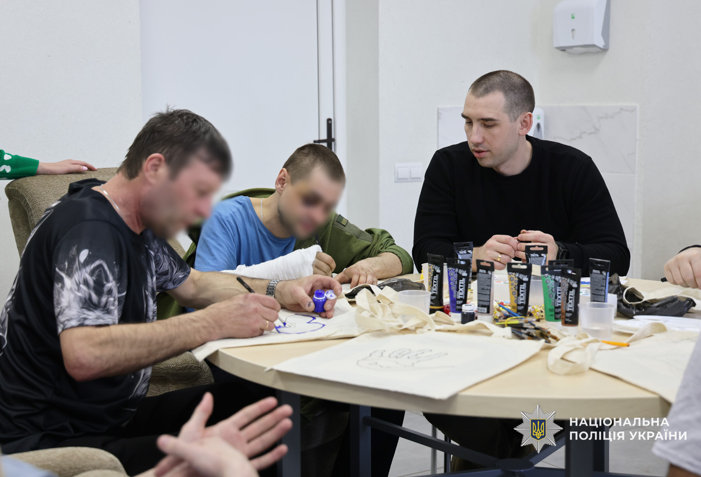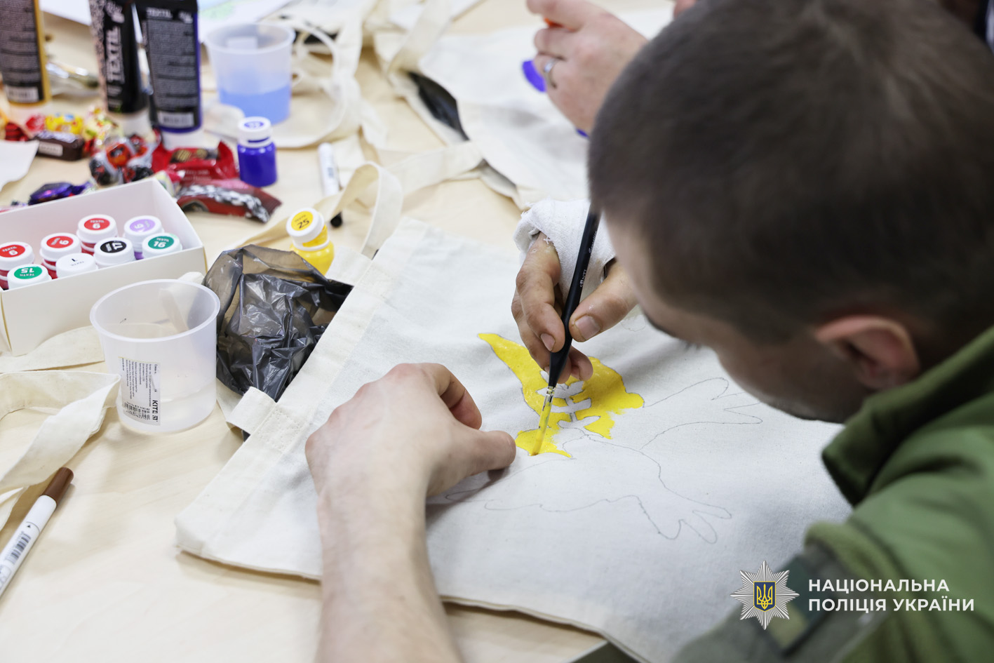 Фахівці психологічної служби поліції Чернігівської області спільно з колегами ДУ «ТМО МВС України по Чернігівській області» провели для поранених творчий майстер-клас з розмальовки еко-сумок. Такий формат роботи обрали невипадково: арттерапія є одним із ефективних методів психологічної підтримки, що допомагає зняти напруження, переключити увагу, відновити внутрішню рівновагу та подарувати позитивні емоції.