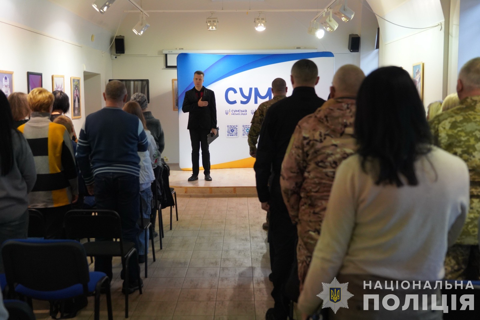 Захід розпочався хвилиною мовчання, під час якої присутні схилили голови в пам’ять про полеглих захисників. До заходу долучились колеги загиблих поліцейських, серед яких і заступник начальника ГУНП в Сумській області Олексій Берещук. Посвідчення рідним загиблих правоохоронців вручили виконуючий обов’язки міського голови Артем Кобзар, його заступник Римма Бикова, помічник начальника Департаменту поліції особливого призначення «Об’єднана штурмова бригада Національної поліції «Лють» В’ячеслав Вусінський.