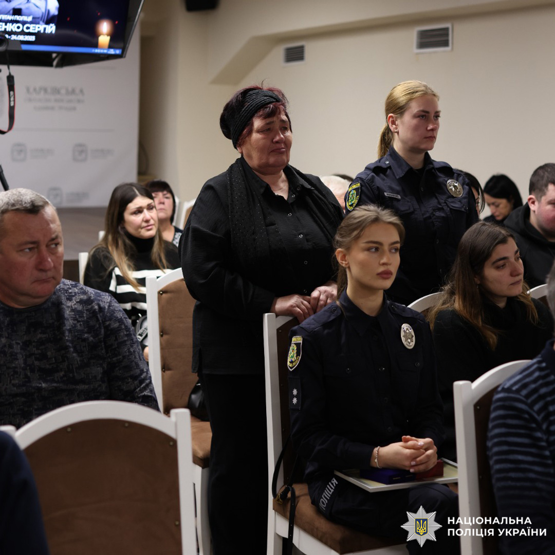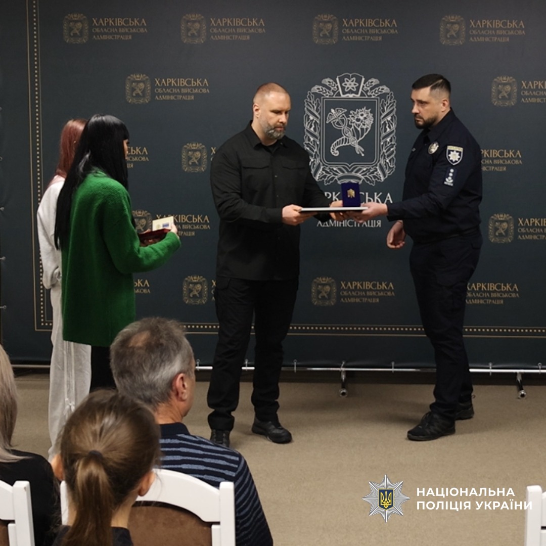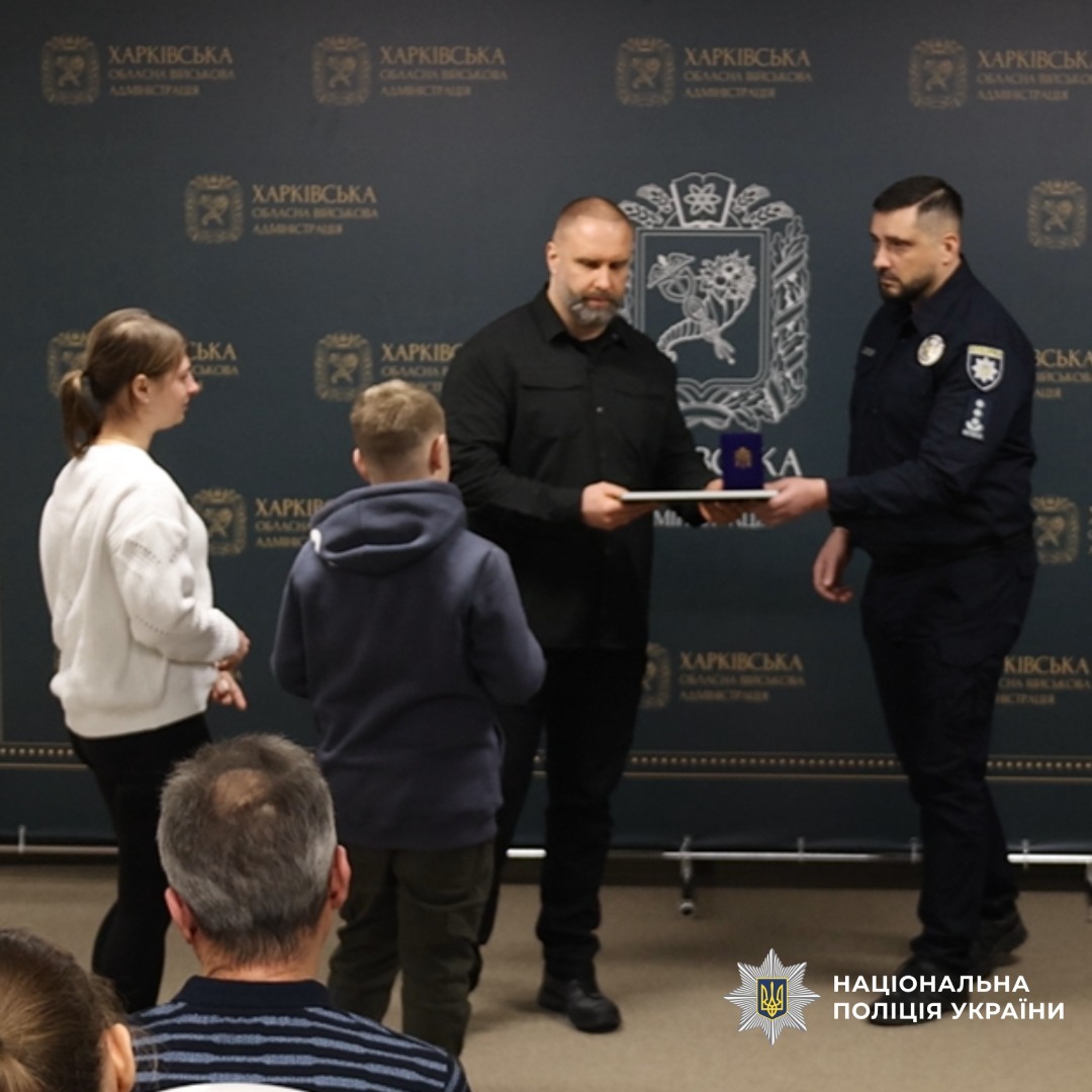 Від імені Президента України державні нагороди родинам 14 поліцейських Харківщини, які героїчно загинули під час виконання службових і бойових завдань, вручили голова Харківської обласної військової адміністрації Олег Синєгубов та начальник Головного управління Національної поліції в Харківській області Петро Токар.