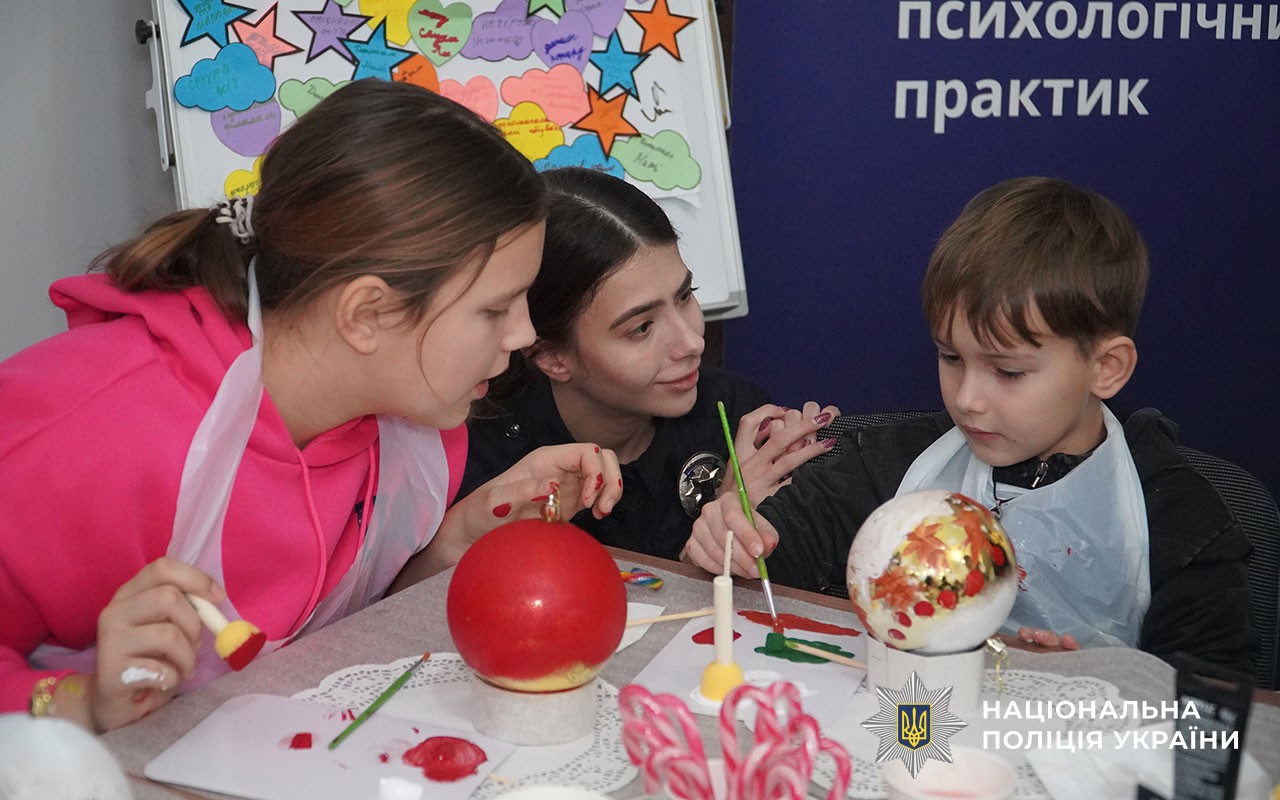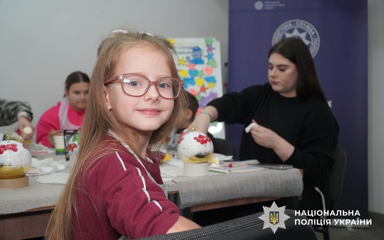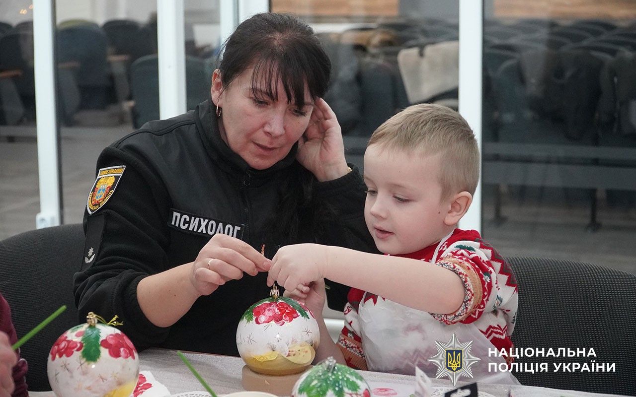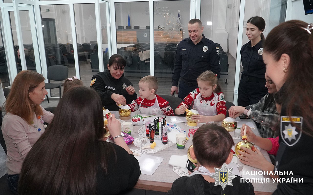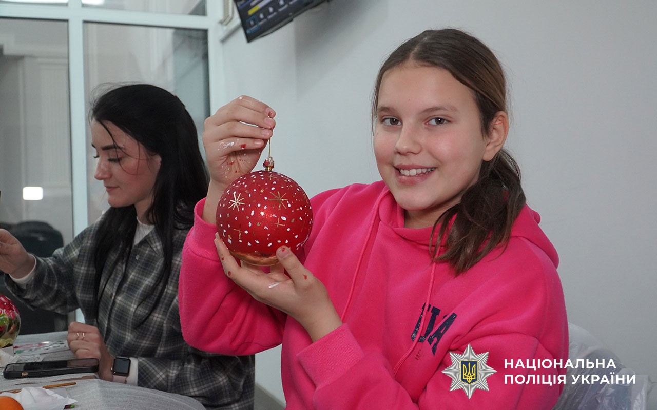 У Головному управлінні Національної поліції Тернопільщини зібралися діти, дружини, батьки поліцейських, котрі не повернулися з війни, аби поспілкуватися, підтримати один одного і навчитися своїми руками створювати святковий декор — розмалювати новорічні кульки та виготовити різдвяного павука.
