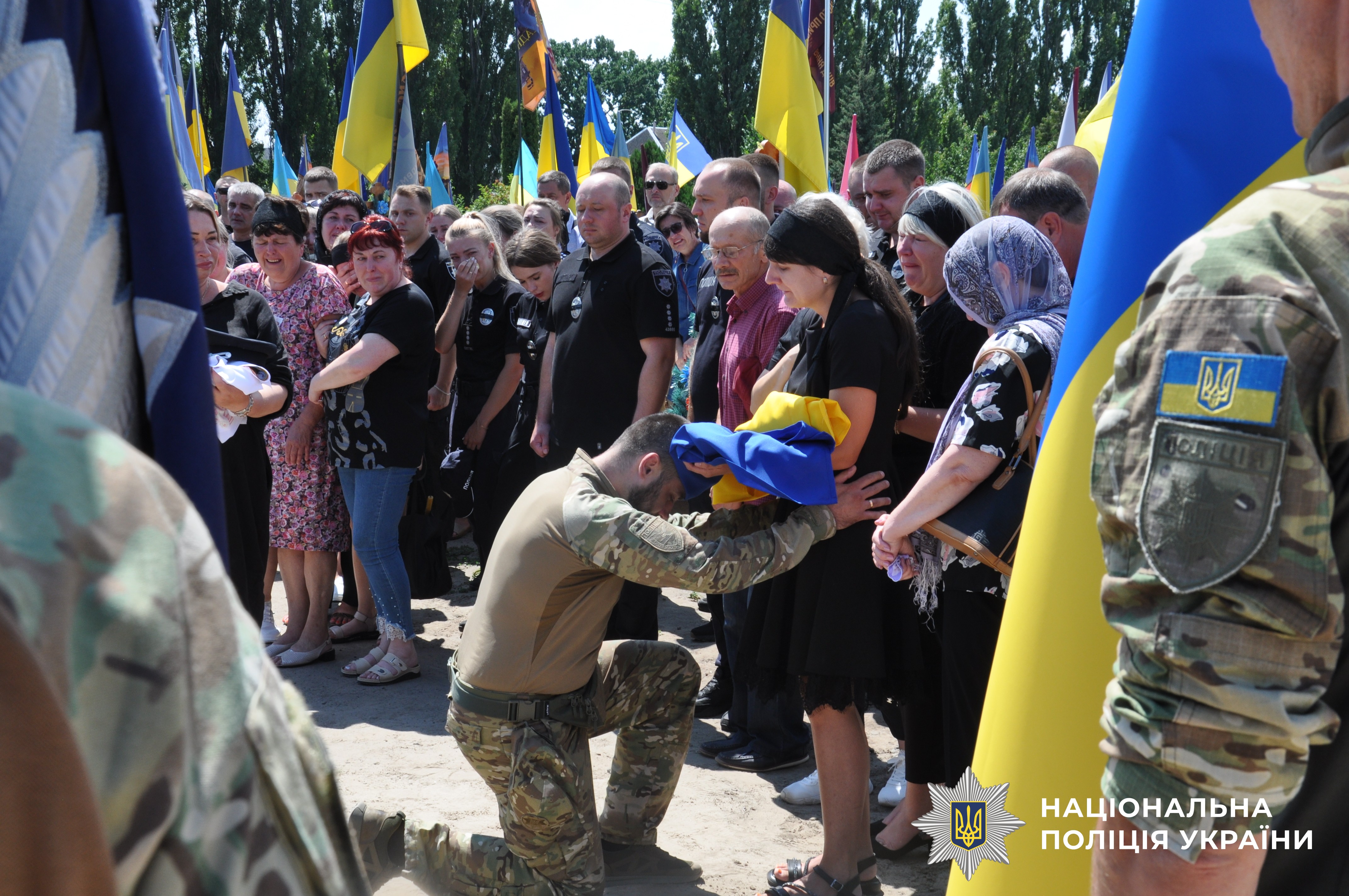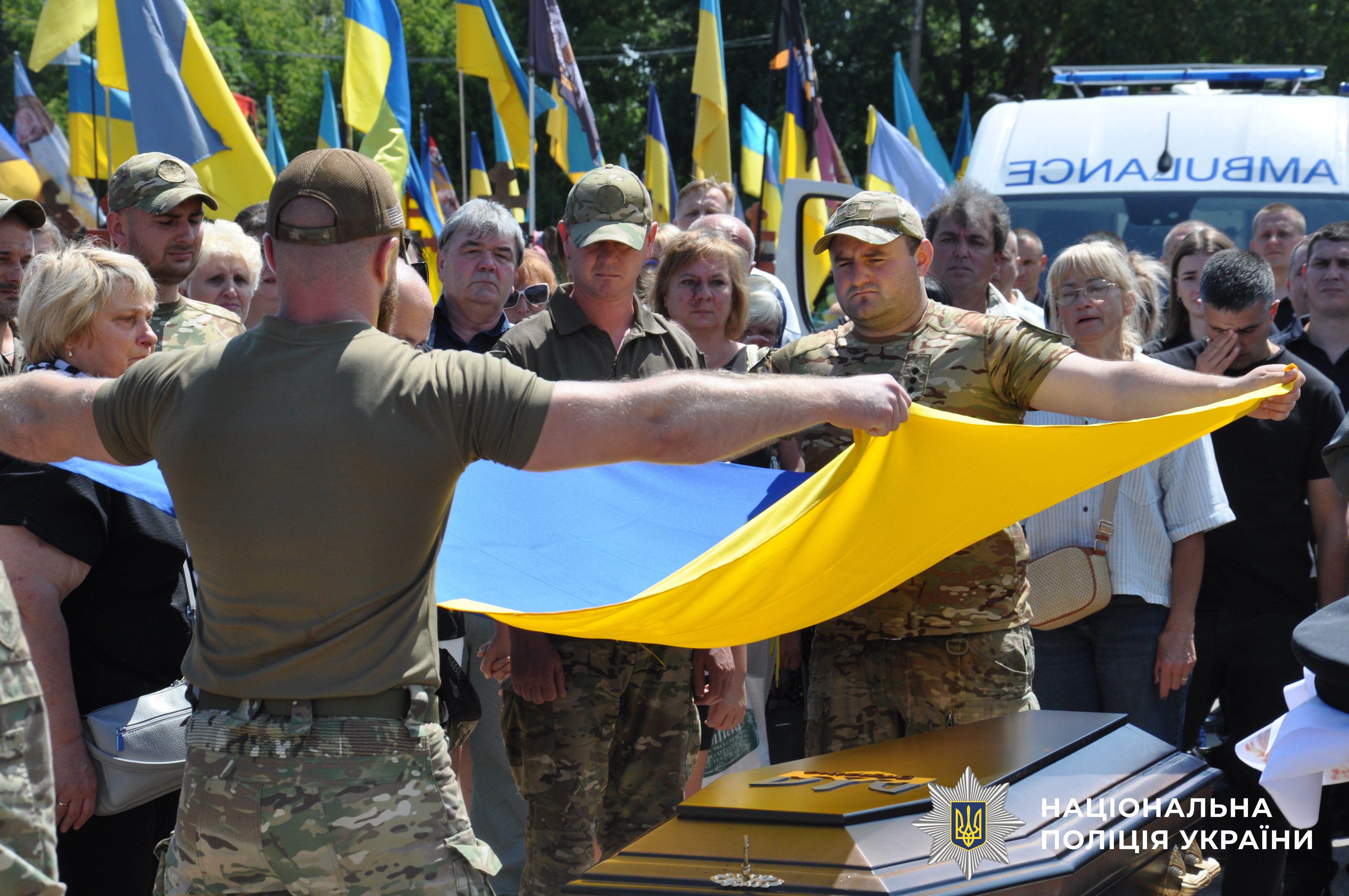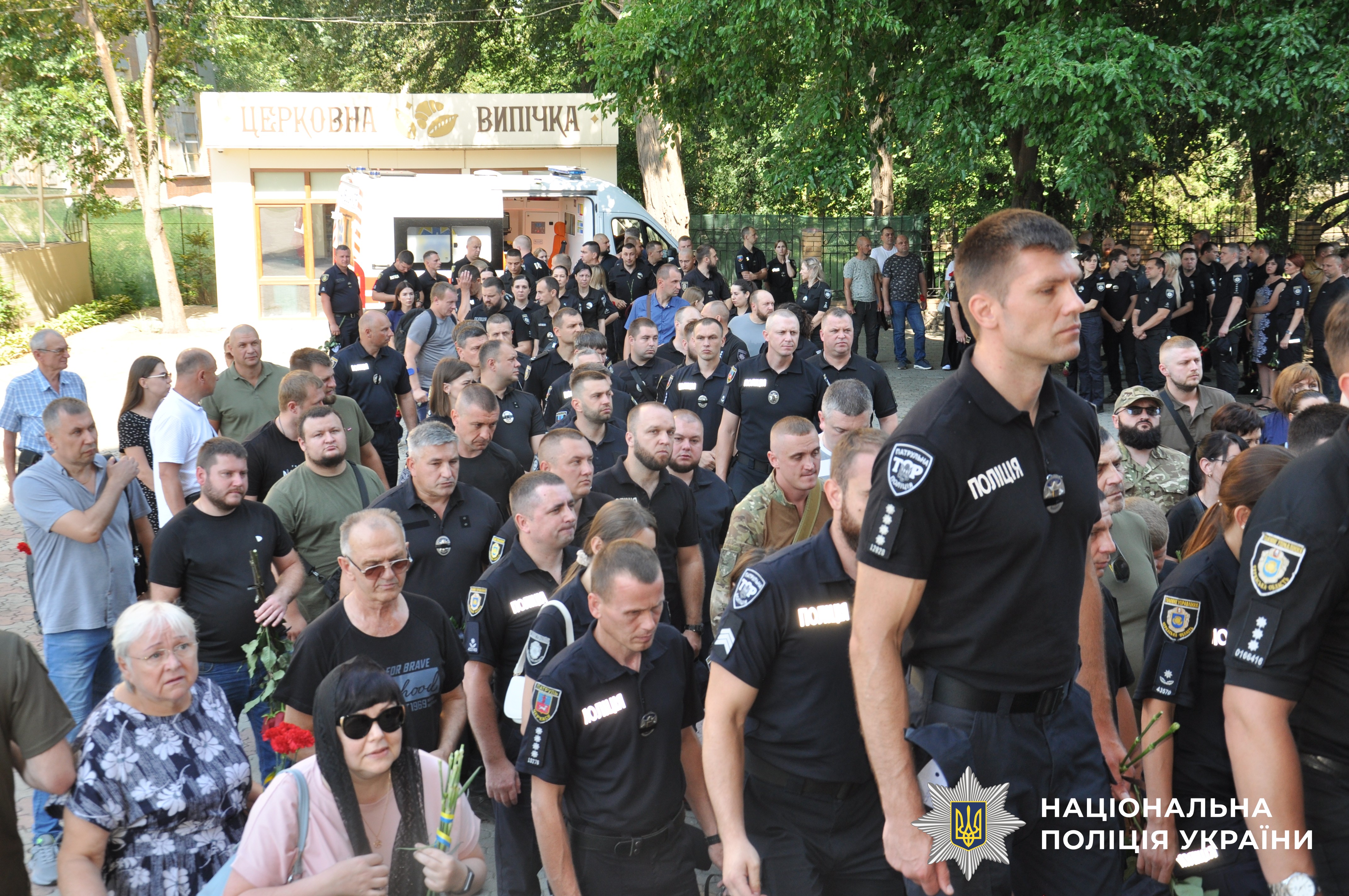 Сьогодні з поліцейським прощалися у Черкасах. Провести його в останню путь зібралися майже тисяча людей: односельці, жителі міста Черкаси, рідні, друзі та колеги.