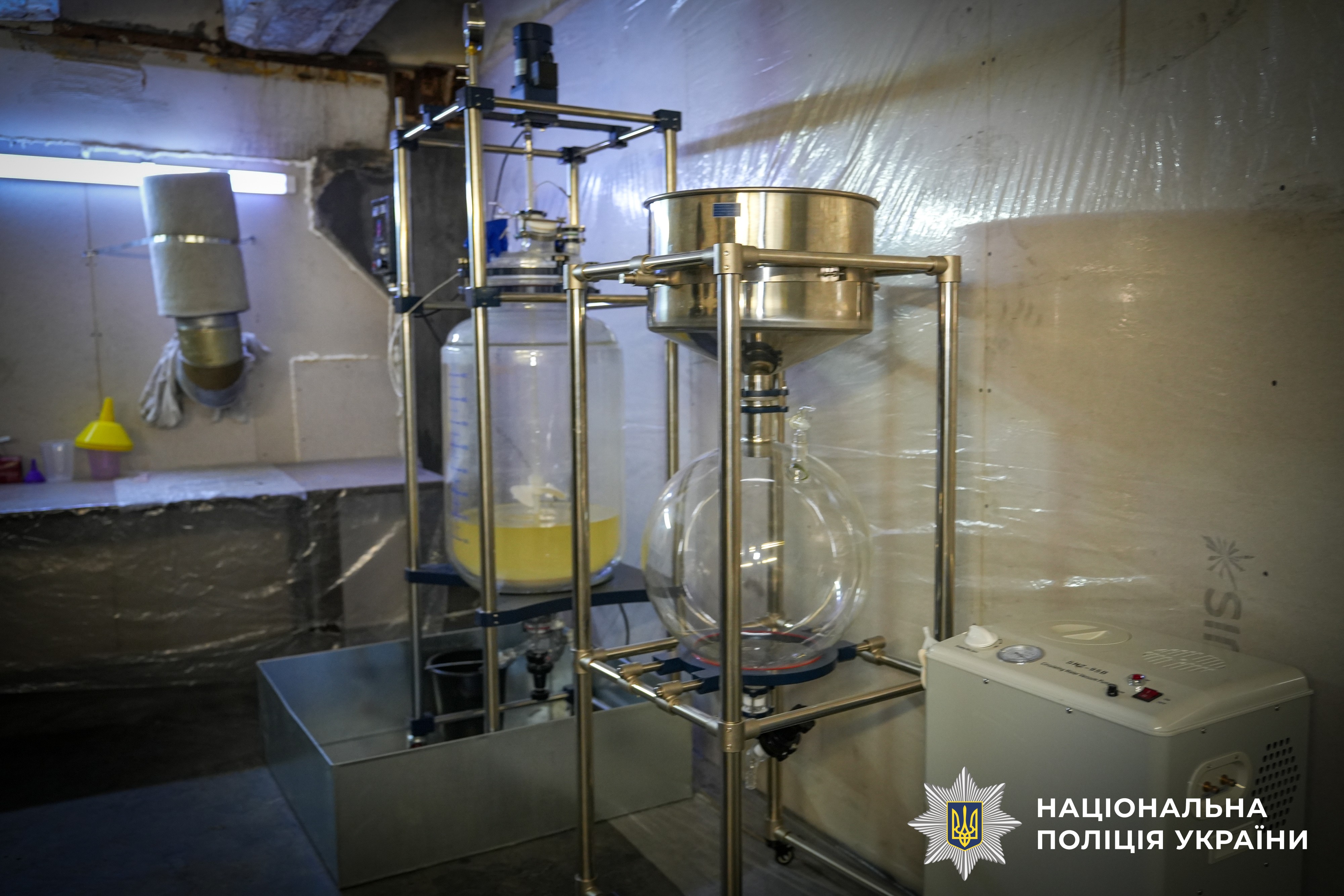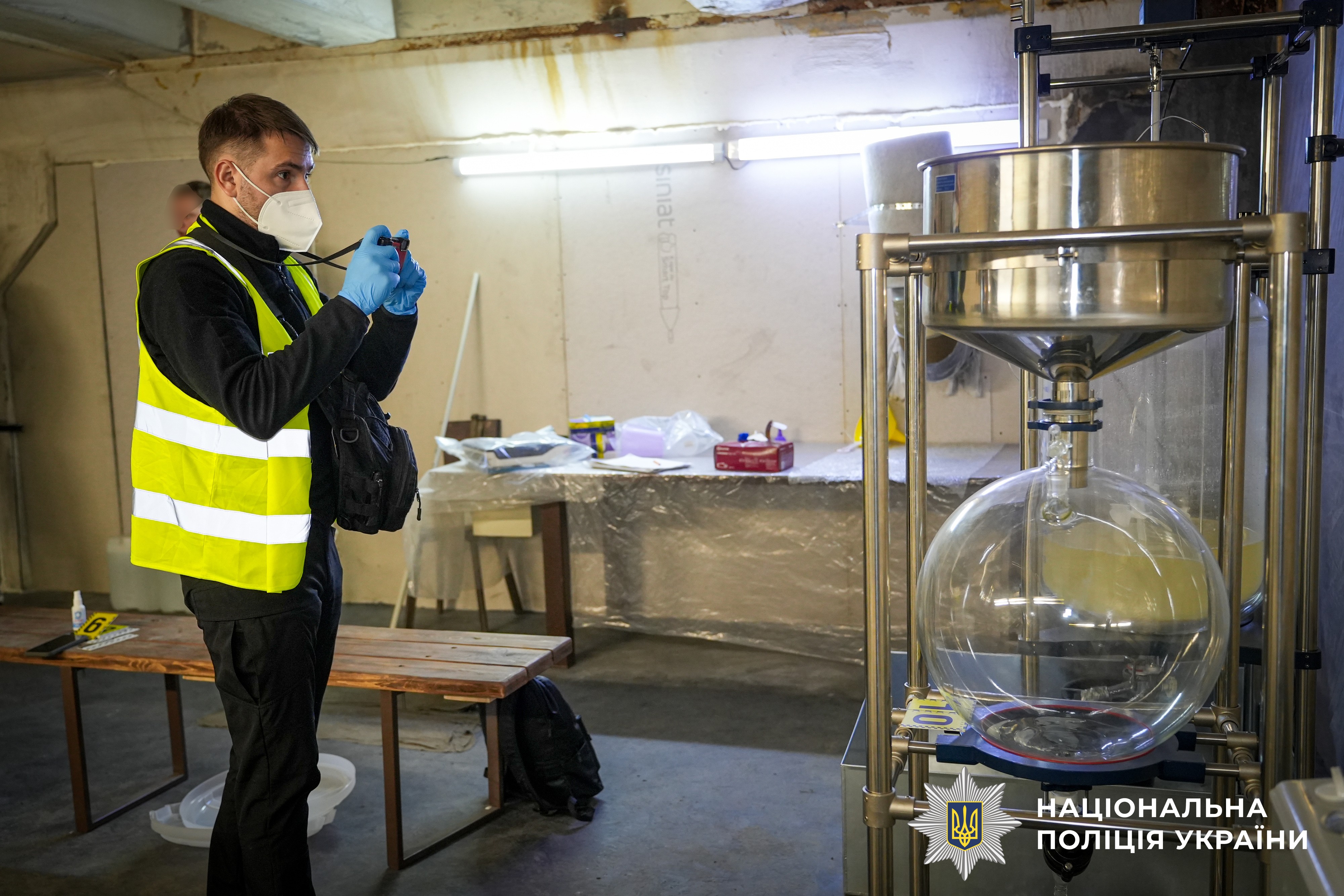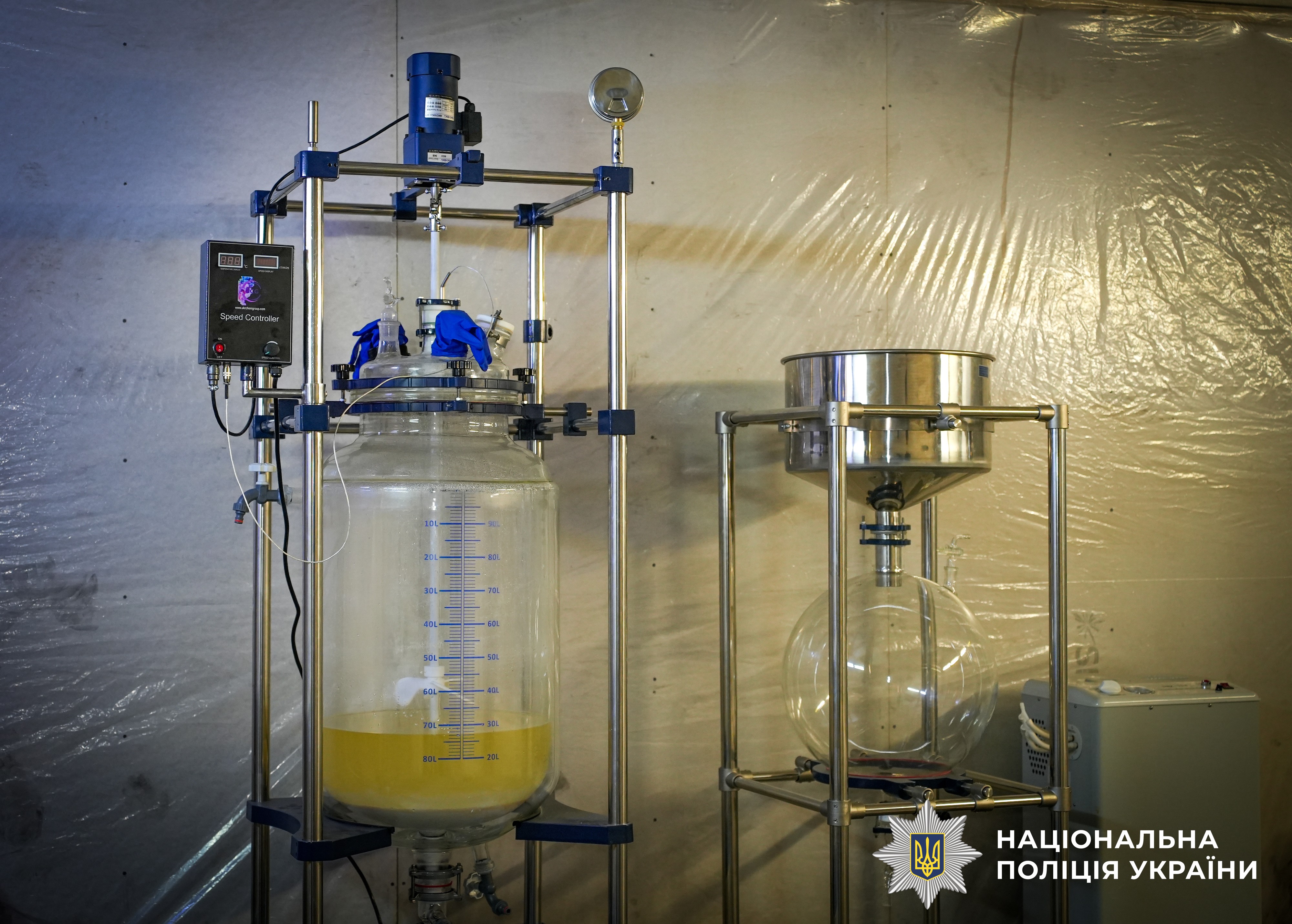 Слідчі Головного слідчого управління Нацполіції за оперативного супроводу Департаменту боротьби з наркозлочинністю НПУ та Служби безпеки України провели обшуки за місцями проживання фігурантів, на складах та в лабораторії, під час яких вилучили лабораторне обладнання, реактори, 44 одиниці вибухівки, 700 літрів хімічних сполук для виробництва психотропів, 5000 літрів прекурсорів, 30 кг солей альфа-РVP та інші речові докази.