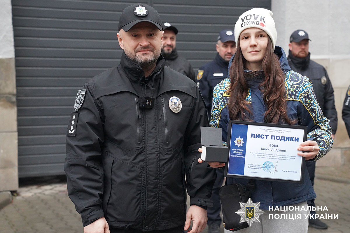 Інструкторка тренінгового центру Головного управління Нацполіції в Тернопільській області Каріна Вовк виборола перше місце на Кубку України з боксу серед жінок. Окрім золотої медалі, спортсменка отримала й окрему відзнаку за найкращу техніку турніру.