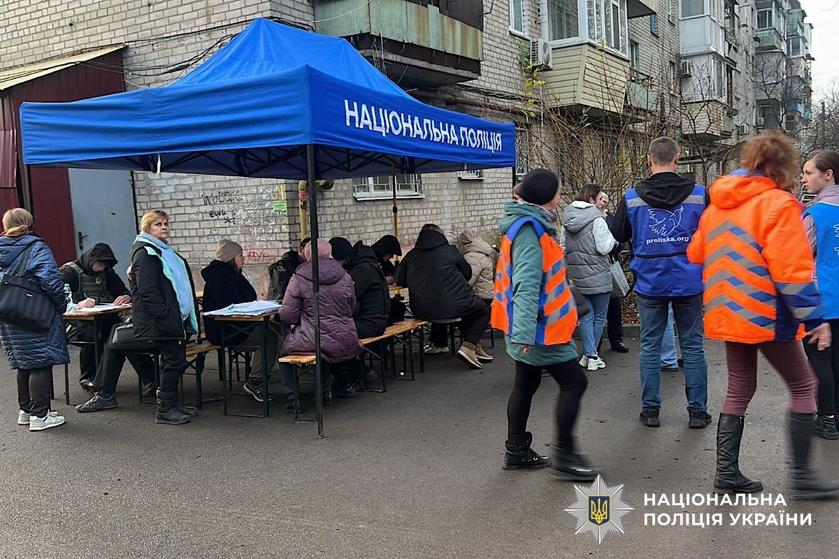 Протягом усієї ночі правоохоронці приймали заяви від мешканців, чиє майно зазнало ушкоджень через вибухи. На місцях подій працювали мобільні пункти прийому звернень громадян.