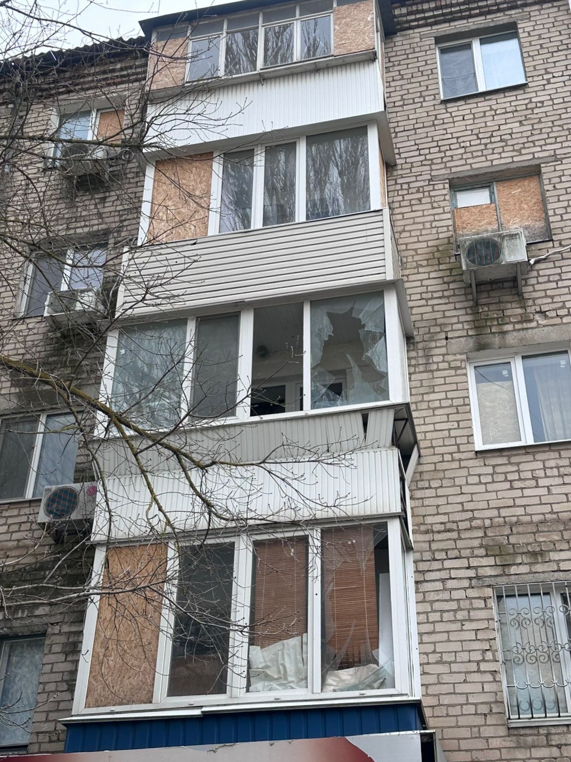 Через скид вибухівки з БпЛА у центральній частині міста 32-річний чоловік отримав мінно-вибухову травму й контузію. Внаслідок артобстрілу пошкоджено багатоквартирний будинок.