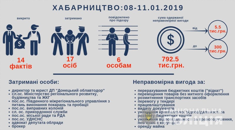Наприклад, за організацію таких корупційних схем були затримані керівник та юрист Державного підприємства «Донецький облавтодор», які одержали 300 тисяч гривень, один із керівників Південного міжрегіонального управління з питань виконання кримінальних покарань та пробації Міністерства юстиції в Одеській області. Також були затримані два представники керівництва Голопристанської виправної колонії № 7 та Дар’ївської виправної колонії № 10, які отримали неправомірної вигоди на загальну суму 96,6 тисяч гривень. Окрім того, затриманий начальник відділу освіти, молоді та спорту однієї з районних державних адміністрацій м. Дніпро, отримав 18 тисяч гривень «відкату».