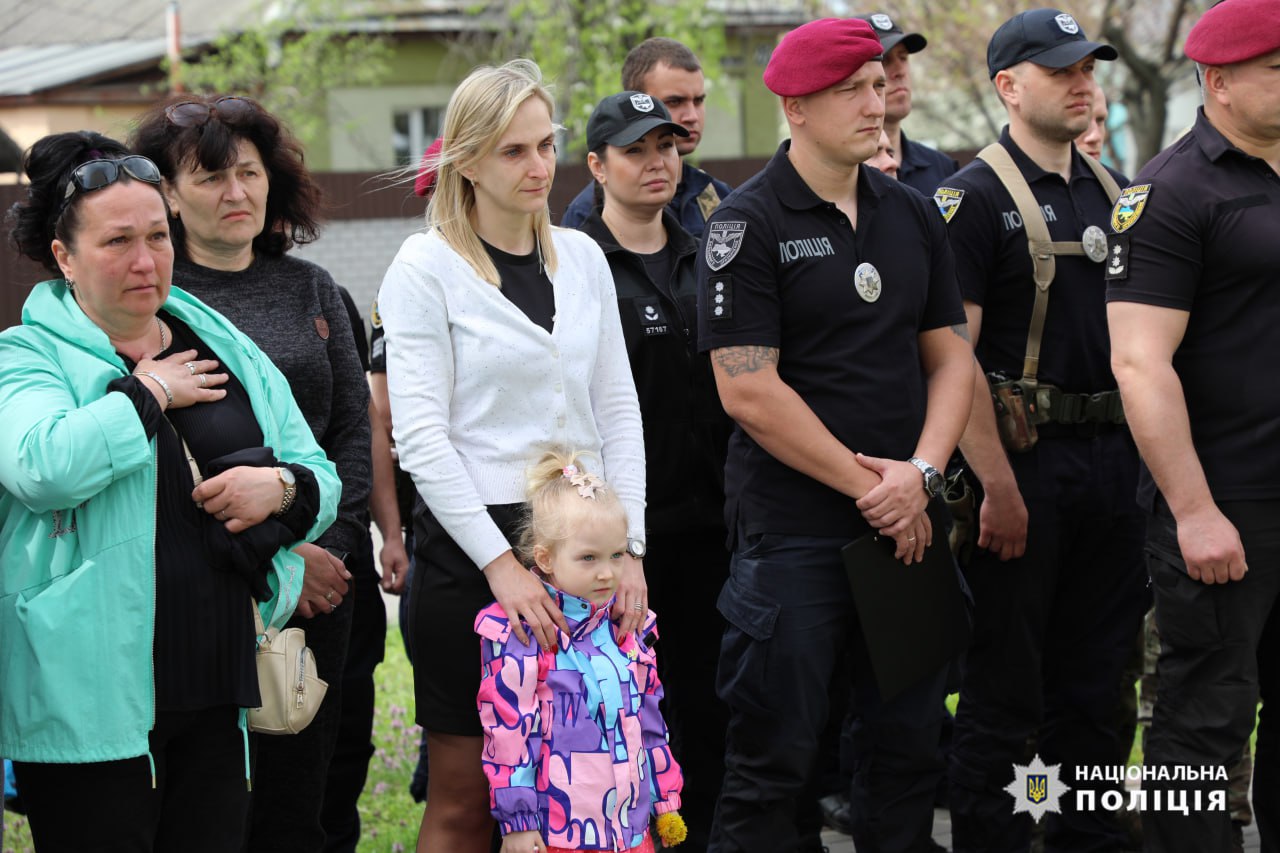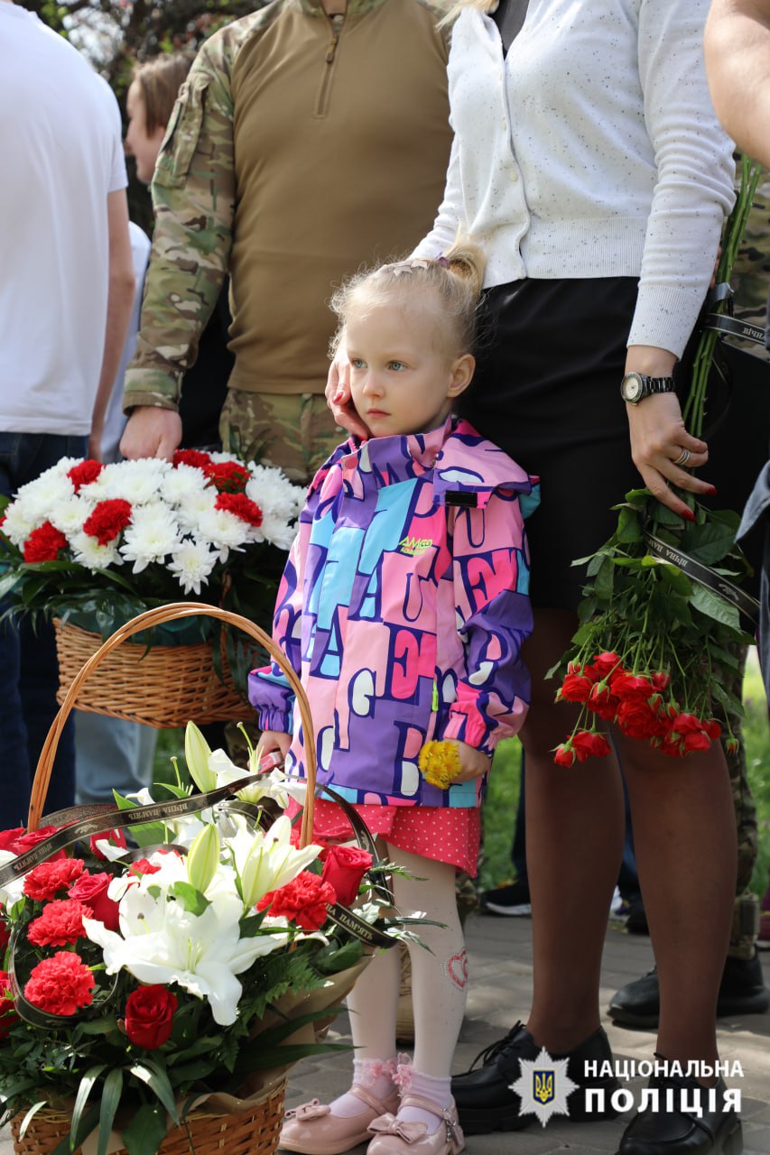 Почесне право відкрити пам’ятну дошку капітану поліції старшому інспектору управління КОРД Віталію Сагайдаку було надано його мамі Світлані Володимирівні, дружині Ользі та донечці Мілані.