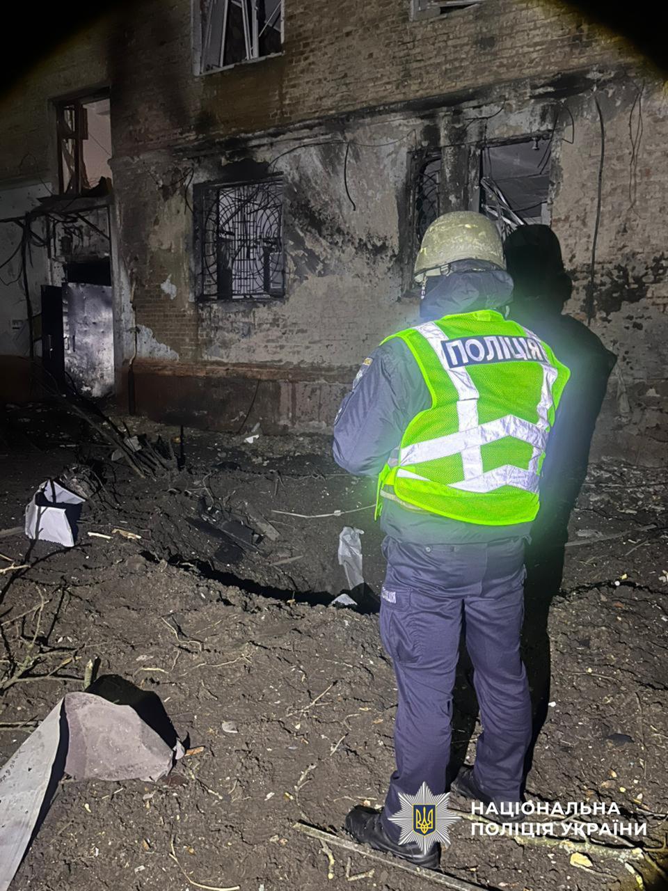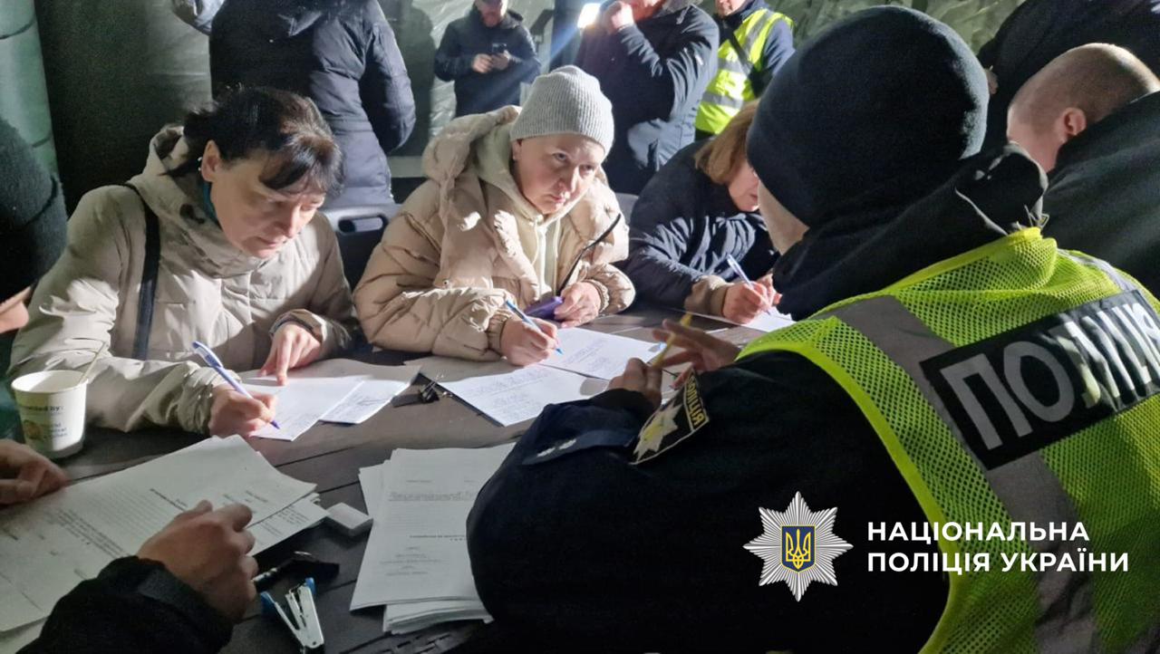 Розгорнуто мобільний пункт, де поліцейські приймають заяви від потерпілих громадян щодо пошкодженого майна. Здійснюється поквартирний обхід постраждалого будинку.