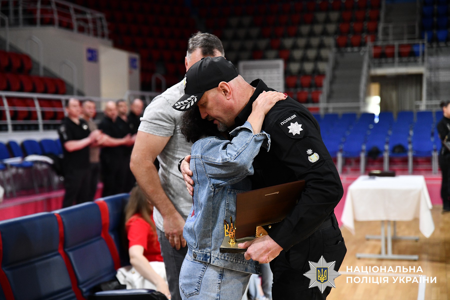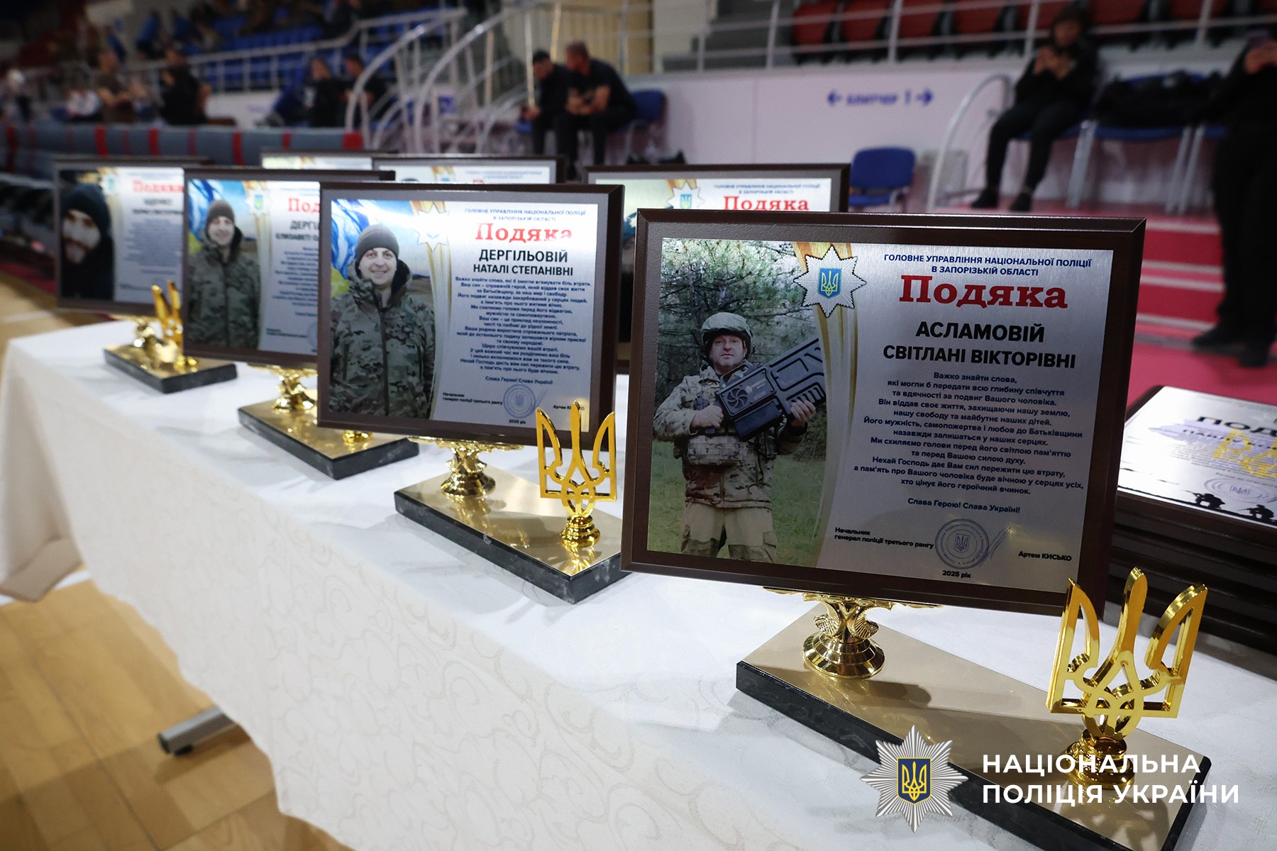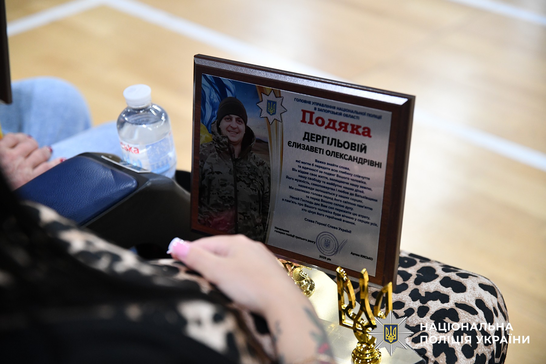 Керівник Головного управління Національної поліції в Запорізькій області вручив пам’ятні відзнаки дружинам та батькам загиблих правоохоронців. Серед них - і Анна Шипунова, дружина загиблого капітана поліції Сергія Шипунова. На чемпіонат вона прийшла зі своїм маленьким сином.
