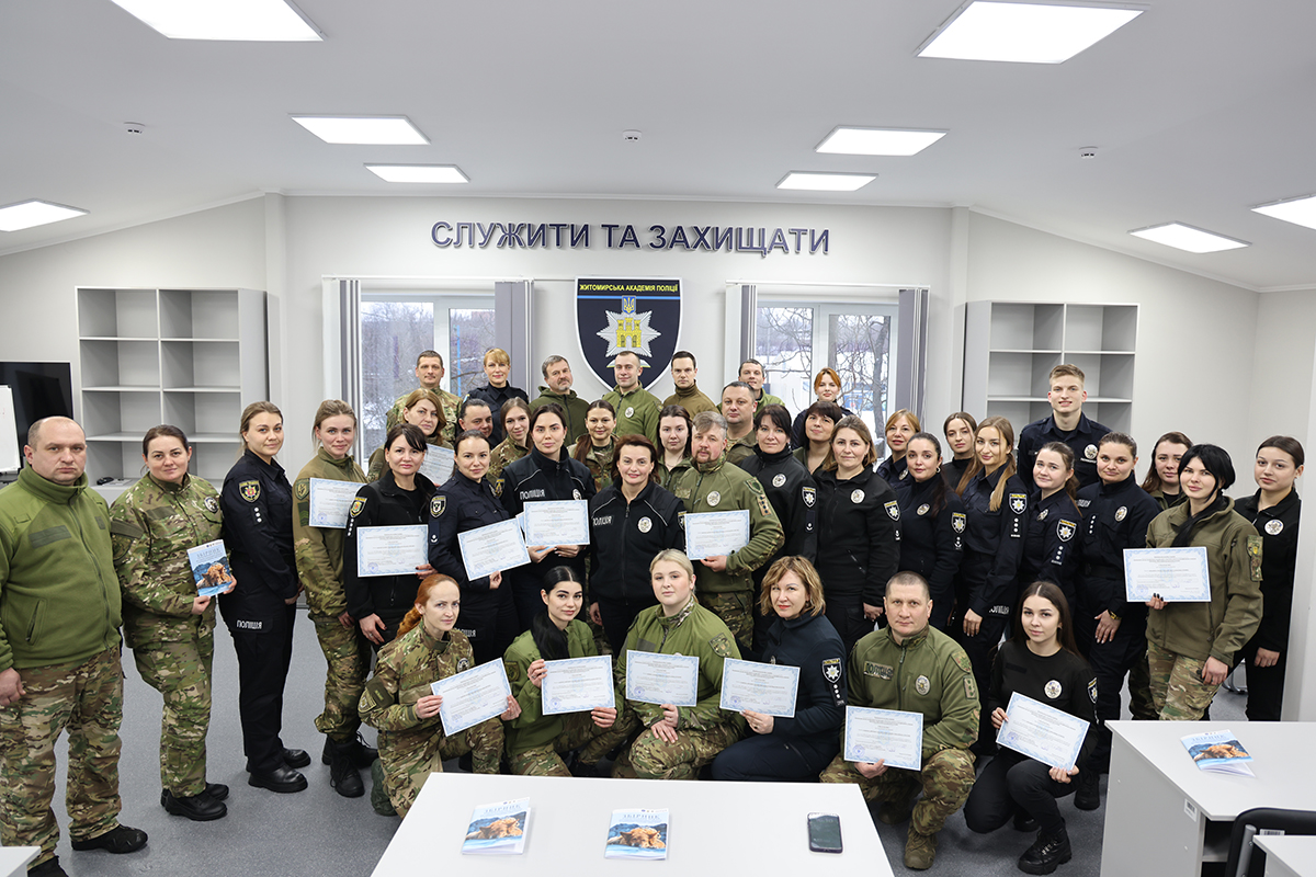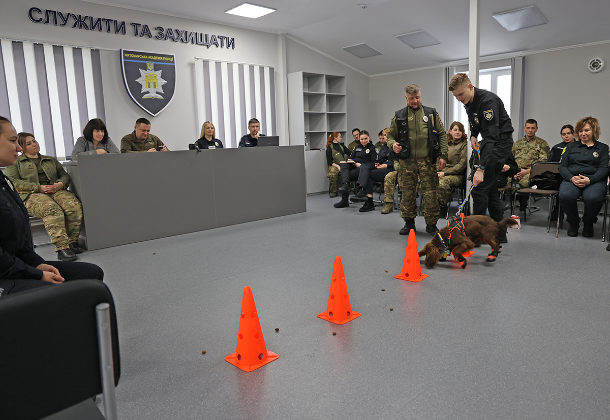На базі Житомирської академії поліції завершився унікальний курс підвищення кваліфікації для поліцейських психологів та кінологів із 17 регіонів України та міста Києва. Головною метою інтенсиву стало вдосконалення навичок психоемоційної підтримки громадян із залученням службових собак – актуальним напрямом психологічного відновлення військових та цивільних.