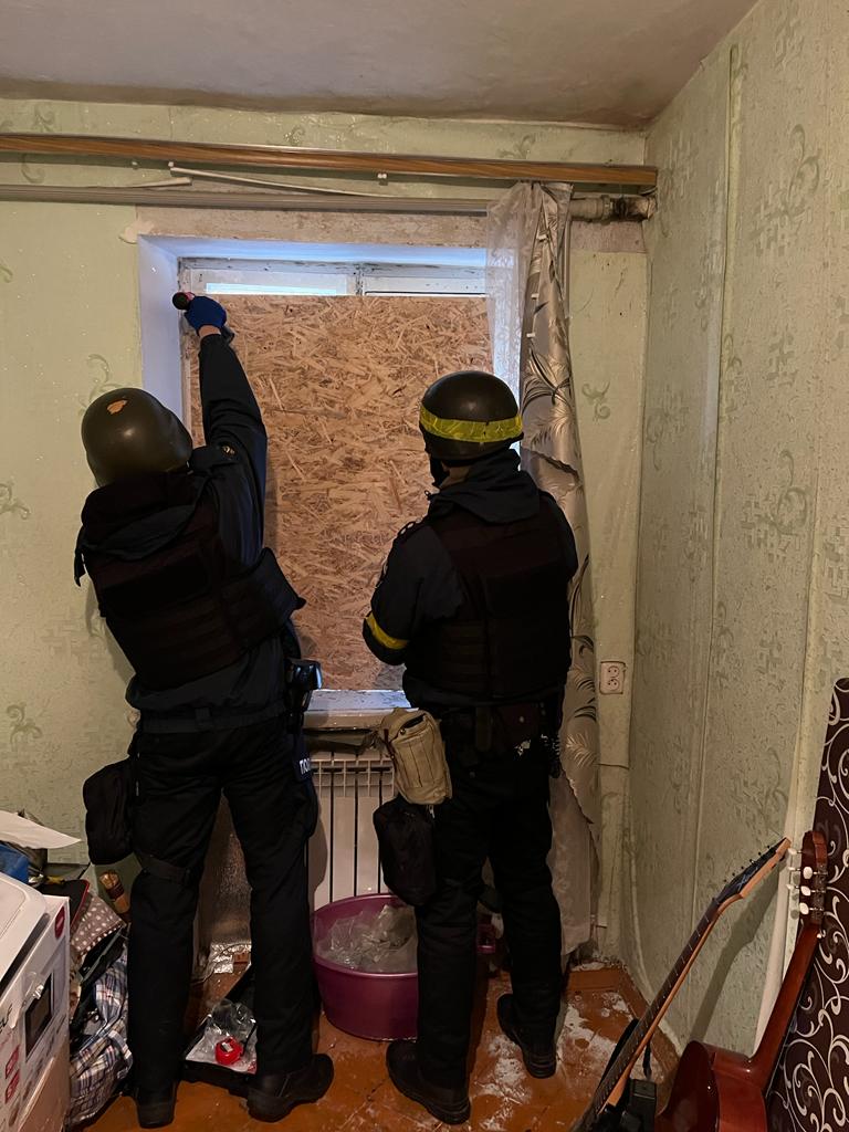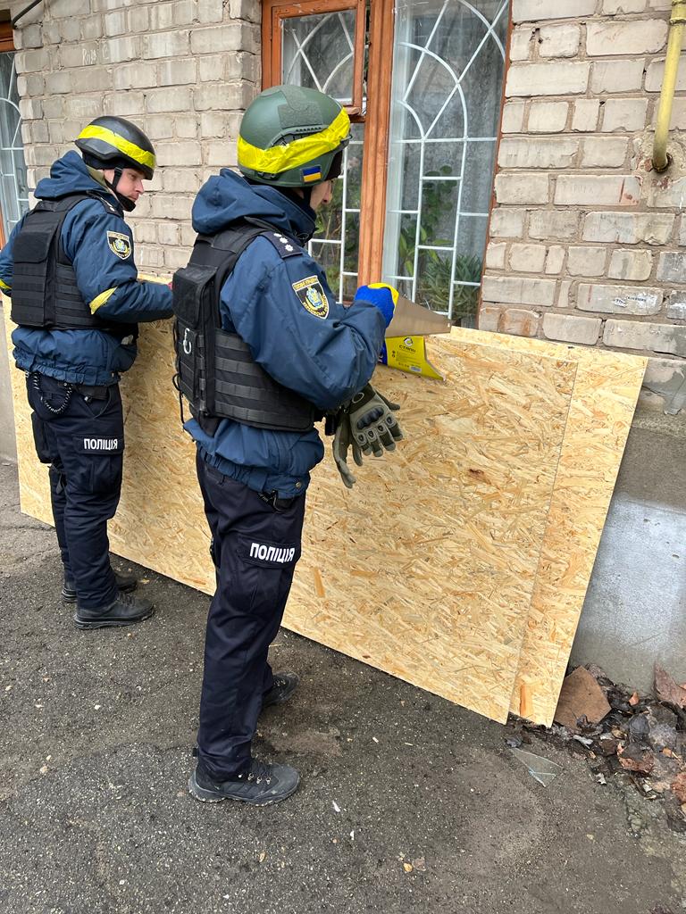Поліцейські спільно з колегами з Нацгвардії та ДСНС привозять містянам будматеріали, фанерними листами закривають вибиті снарядами або вибуховою хвилею віконні та дверні отвори, балконні рами.