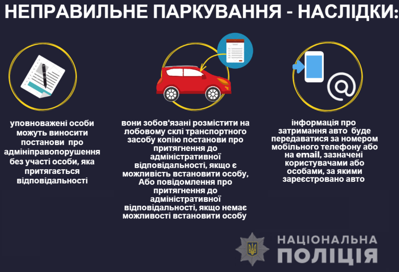 Він додав, що якщо адміністративне правопорушення, передбачене частинами 1, 3 ст. 122 (в частині порушення правил зупинки, стоянки), частинами 1, 2 ст. 152-1 Кодексу України про адміністративні правопорушення, зафіксовано в режимі фотозйомки (відеозапису), посадова особа уповноваженого підрозділу Національної поліції або інспектор з паркування зобов’язані розмістити на лобовому склі транспортного засобу копію постанови про притягнення до адміністративної відповідальності. Це відбувається за умови, якщо технічні можливості дозволяють встановити відповідальну особу на місці вчинення правопорушення. Якщо ж технічні можливості не дозволяють цього зробити, уповноважена особа має розмістити на лобовому склі транспортного засобу повідомлення про притягнення до адміністративної відповідальності.