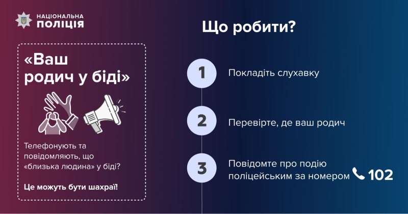 Поліцейські нагадують: щоби не потрапити у подібну ситуацію, покладіть слухавку і не поспішайте виконувати вказівки незнайомців! Насамперед переконайтеся, чи дійсно людина потребує допомоги: зателефонуйте їй або найближчим родичам. Попри емоції, уважно перевіряйте інформацію у представників профільних служб. Якщо у вас є будь-які сумніви – одразу зателефонуйте в поліцію.