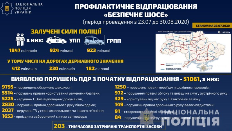 Упродовж профілактичного відпрацювання «Безпечне шосе», що розпочалося 23 липня, щодоби на чергування заступають майже 1900 екіпажів. Понад 400 - несуть службу на дорогах державного значення.