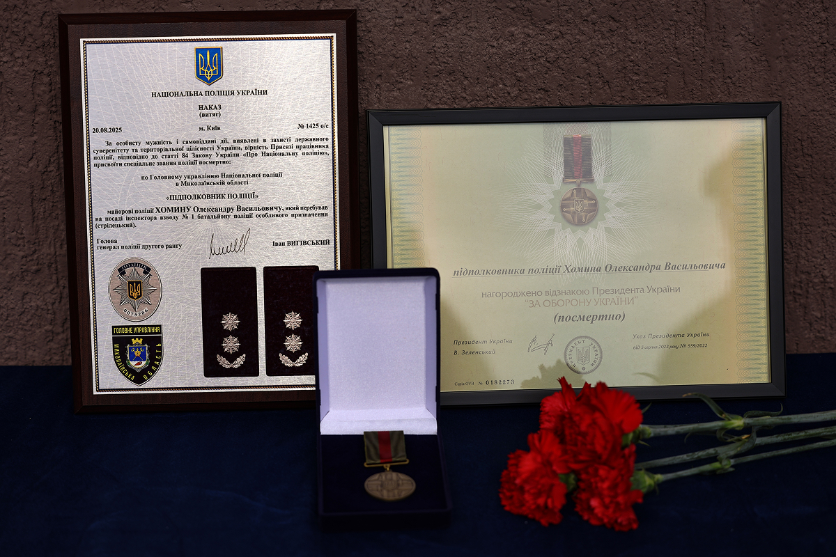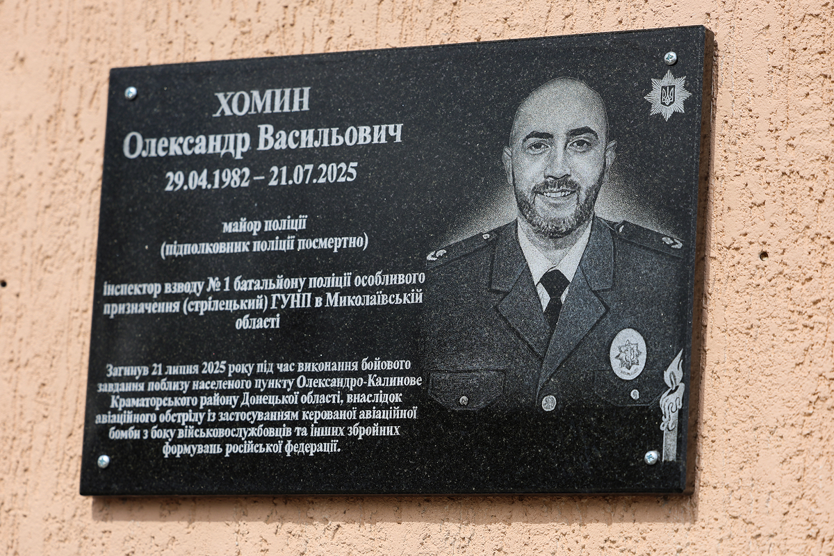 Боєць батальйону поліції особливого призначення (стрілецький) торік трагічно загинув під час виконання бойового завдання на Донеччині. Меморіальну дошку в пам'ять про підполковника поліції Олександра Хомина встановили на стіні відділку поліції у Новій Одесі. Майже 20 років захисник ніс службу у лавах органів внутрішніх справ, перебуваючи на різних посадах. Перед тим як приєднався до стрілецького батальйону, забезпечував правопорядок та безпеку, як дільничний офіцер поліції у м. Нова Одеса.
