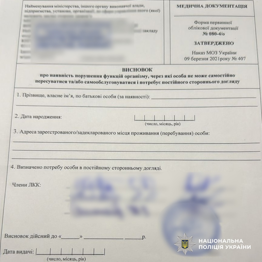 Спільники за гроші надавали документи по догляду за членом сім’ї, аби їх клієнти уникнули військової служби. Серед учасників злочинної схеми була чиновниця районної державної адміністрації, яка на підставі фіктивних відомостей оформлювала документи. Під час обшуку у фігурантів вилучили близько 1000 актів на фіктивних опікунів.
