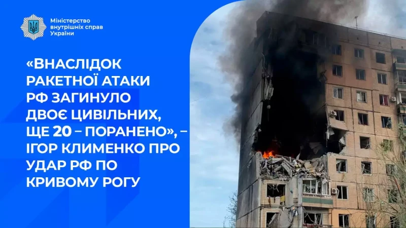«Внаслідок ракетної атаки рф загинуло двоє цивільних, ще 20 – поранено», – Ігор Клименко про удар рф по Кривому Рогу