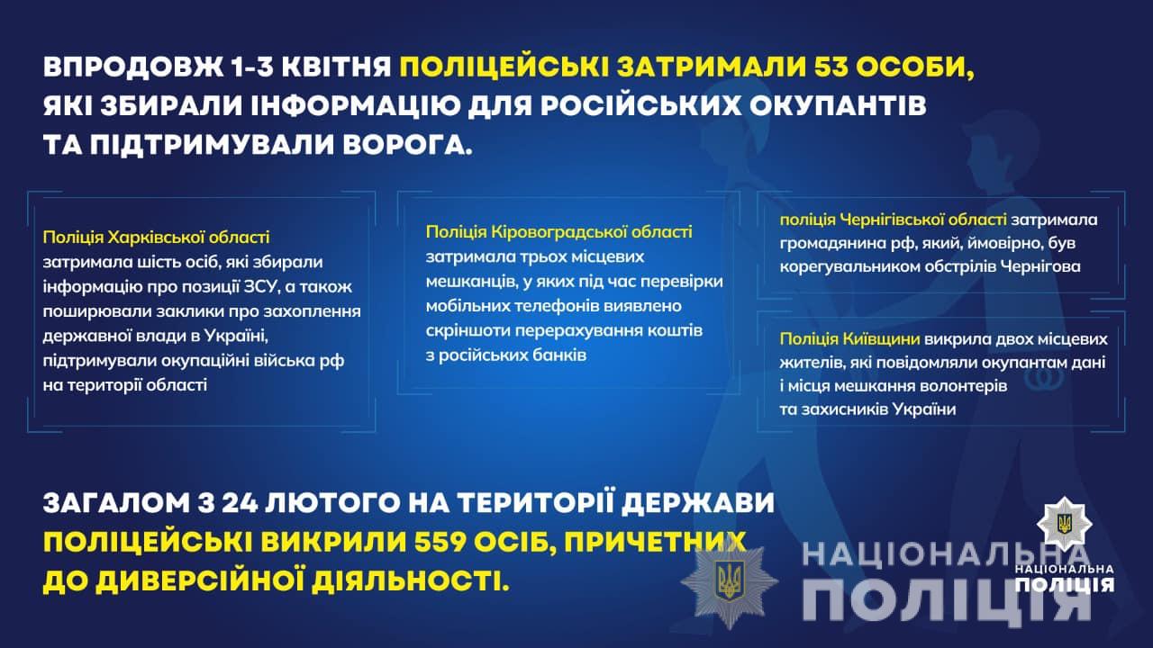 Впродовж 1-3 квітня працівники Національної поліції України затримали 53 особи, які збирали інформацію для російських окупантів та підтримували ворога. Зокрема, поліція Харківської області затримала 6 осіб, які збирали інформацію про позиції ЗСУ, а також поширювали заклики про захоплення державної влади в Україні, підтримували окупаційні війська рф на території області.