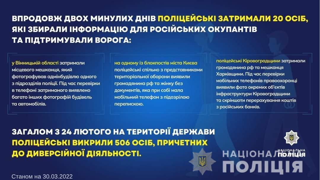 Загалом з 24 лютого на території держави поліцейські викрили 506 осіб, причетних до диверсійної діяльності.