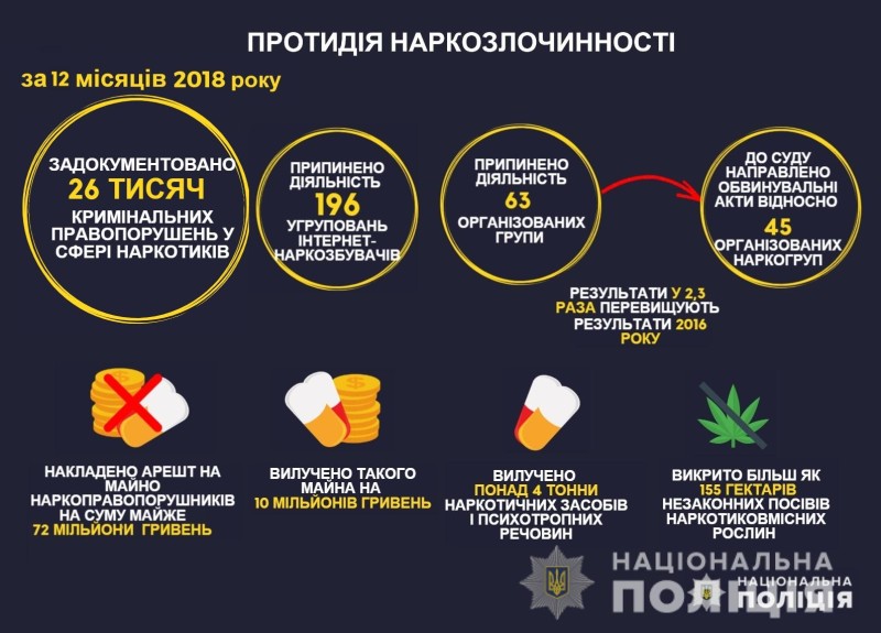 «Рівень вилучення наркозасобів виріс порівняно з 2017 роком удвічі. Протягом 2018 року з незаконного обігу вилучено понад 4 тонни наркотичних засобів і психотропних речовин, зокрема - понад 8 кг кокаїну і героїну, більше 40 кг стимуляторів амфетамінового ряду та 4 кг нових психоактивних речовин. Вилучених з незаконного обігу наркотиків і психотропів вистачило б на виготовлення понад 5 млн. разових доз наркотиків і психотропів»,- зазначив начальник Департаменту протидії наркозлочинності Андрій Кіхтенко.