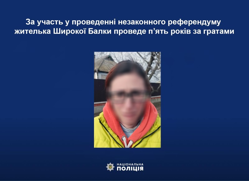 Під час слідства поліцейські з’ясували, що в порушення вимог українського законодавства під час окупації правобережжя Херсонщини 38-річна жителька Широкої Балки взяла активну участь у проведенні псевдореферендуму щодо входу області до складу рф.