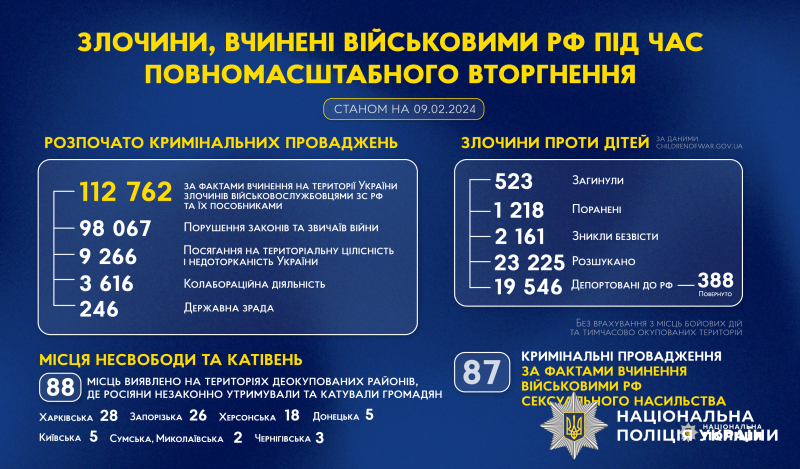 Злочини, вчинені військовими рф під час повномасштабного вторгнення в Україну (станом на 09.02.2024)