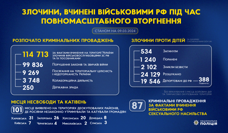З початку повномасштабного вторгнення росії в Україну слідчі Національної поліції України розпочали 114 713 кримінальних проваджень за фактами вчинення на території України злочинів військовослужбовцями збройних сил російської федерації та їхніми пособниками.