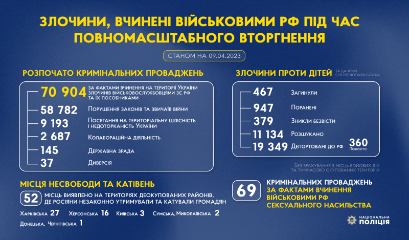 З початку повномасштабного вторгнення росії в Україну слідчі Національної поліції України розпочали 70 904 кримінальні провадження за фактами вчинення на території України злочинів військовослужбовцями збройних сил російської федерації та їхніми пособниками.