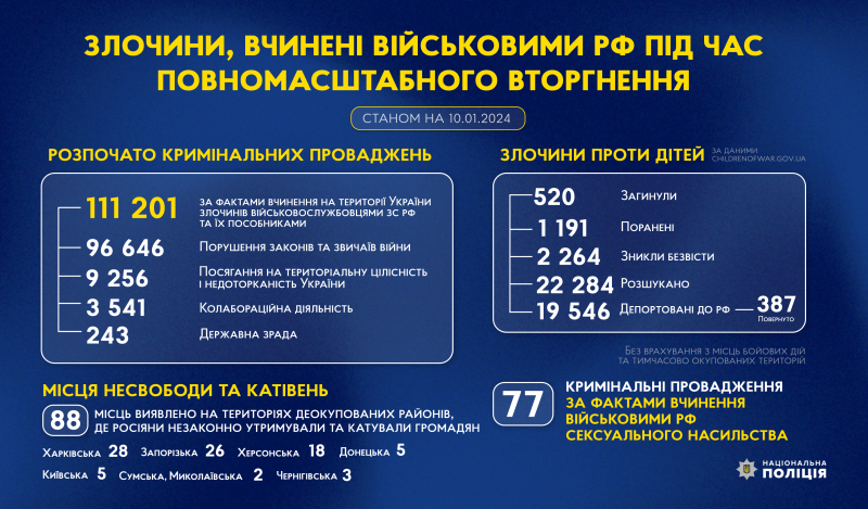 З початку повномасштабного вторгнення росії в Україну слідчі Національної поліції України розпочали 111 201 кримінальних проваджень за фактами вчинення на території України злочинів військовослужбовцями збройних сил російської федерації та їхніми пособниками.
