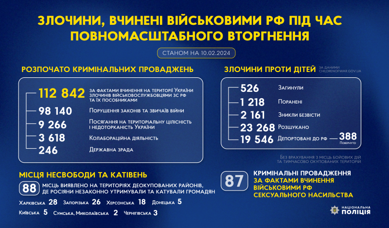 Злочини, вчинені військовими рф під час повномасштабного вторгнення в Україну (станом на 10.02.2024)