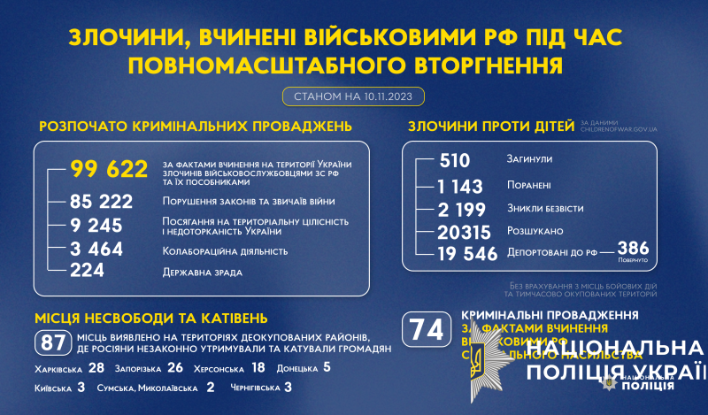 З початку повномасштабного вторгнення росії в Україну слідчі Національної поліції України розпочали 99 622 кримінальні провадження за фактами вчинення на території України злочинів військовослужбовцями збройних сил російської федерації та їхніми пособниками.