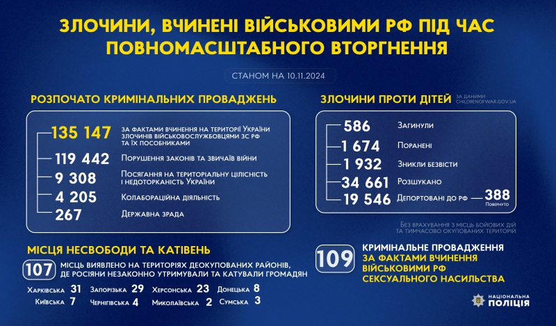 З початку повномасштабного вторгнення росії в Україну слідчі Національної поліції України розпочали 135 147 кримінальних проваджень за фактами вчинення на території України злочинів військовослужбовцями збройних сил російської федерації та їхніми пособниками.