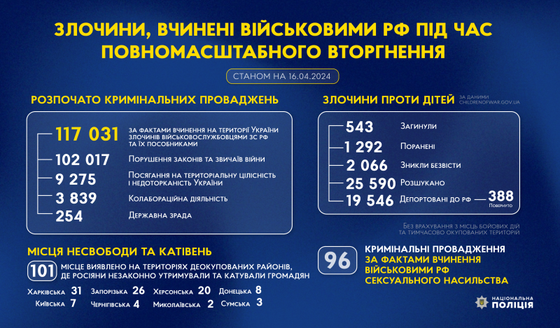 Злочини, вчинені військовими рф під час повномасштабного вторгнення в Україну (станом на 16.04.2024)