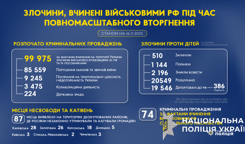 З початку повномасштабного вторгнення росії в Україну слідчі Національної поліції України розпочали 99 975 кримінальних проваджень за фактами вчинення на території України злочинів військовослужбовцями збройних сил російської федерації та їхніми пособниками.