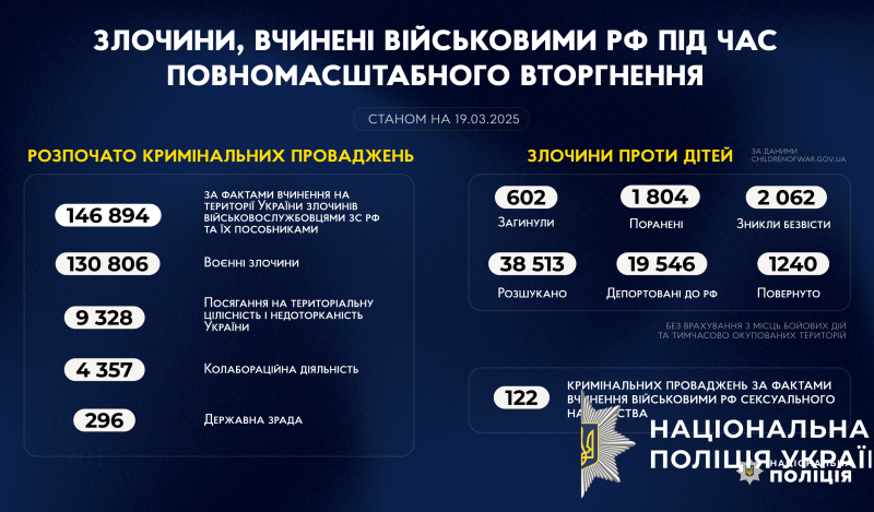 З початку повномасштабного вторгнення росії в Україну слідчі Національної поліції України розпочали 145 894 кримінальних проваджень за фактами вчинення на території України злочинів військовослужбовцями збройних сил російської федерації та їхніми пособниками.