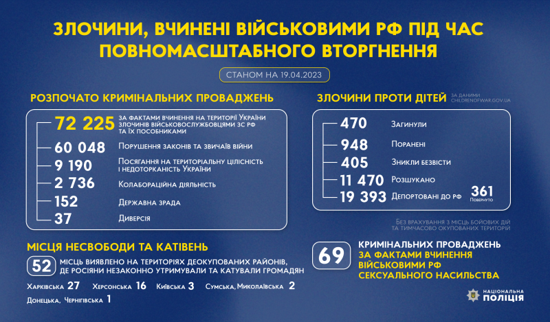 З початку повномасштабного вторгнення росії в Україну слідчі Національної поліції України розпочали 72 225 кримінальних проваджень за фактами вчинення на території України злочинів військовослужбовцями збройних сил російської федерації та їхніми пособниками.