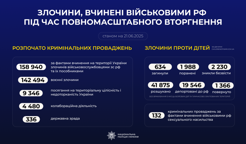 З початку повномасштабного вторгнення росії в Україну слідчі Національної поліції України розпочали 158 940 кримінальних проваджень за фактами вчинення на території України злочинів військовослужбовцями збройних сил російської федерації та їхніми пособниками.